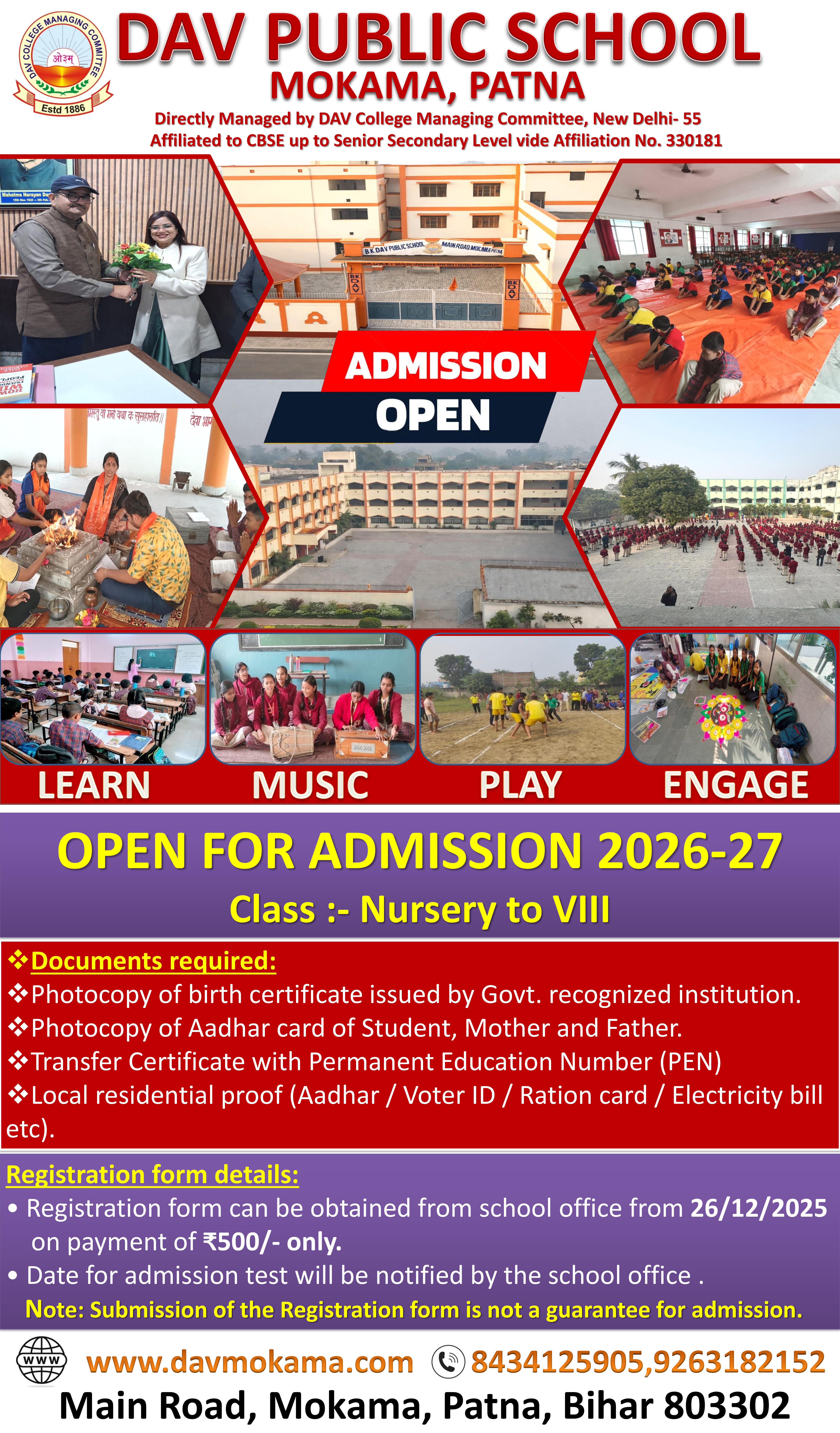 DAV Public School, Mokama Main Road, Mokama, Patna, Bihar, 803302 E-Mail: mdavpsmokama@yahoo.com